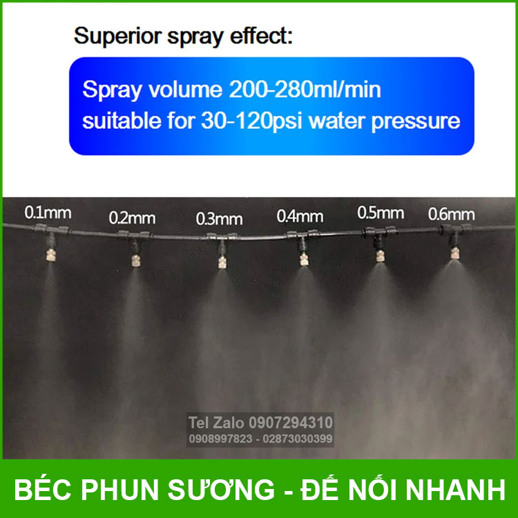 Béc phun sương chuyên dùng để phun làm mát nóc nhà, sân vườn, phun sương làm mát lan can, phun sương tưới lan, phun sương làm mát nhà yến, phun sương làm mát nhà xưỡng, hệ thống tưới thuỷ canh, phun sương sân thượng, phun sương trồng nấm.